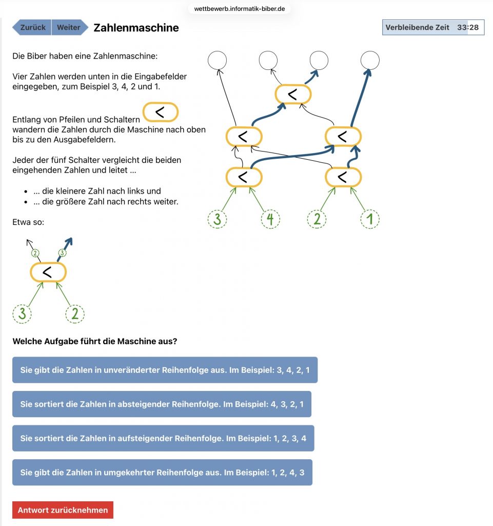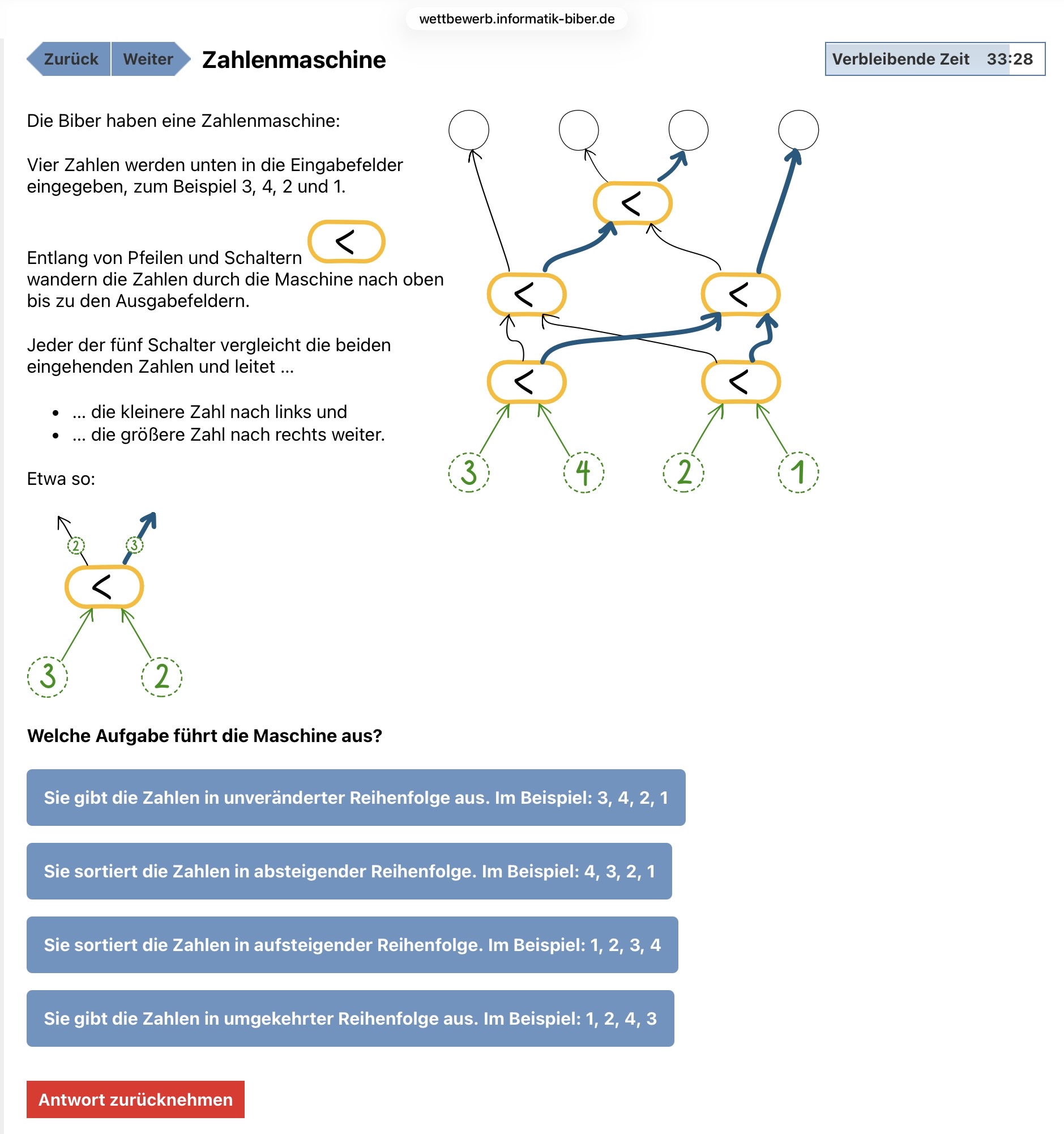 Wer selbst Lust bekommen hat, Informatik-Rätsel auszuprobieren, kann sich an der Originalaufgabe „Zahlenmaschine“ versuchen. Weitere Beispiele gibt es auf der Website des Wettbewerbs: https://bwinf.de/biber/
