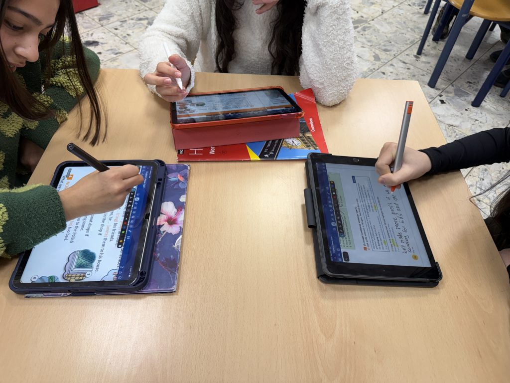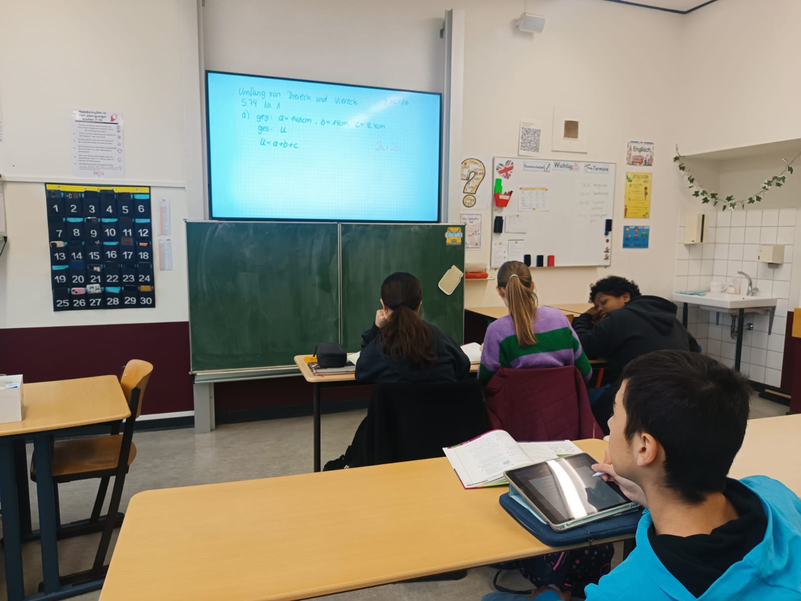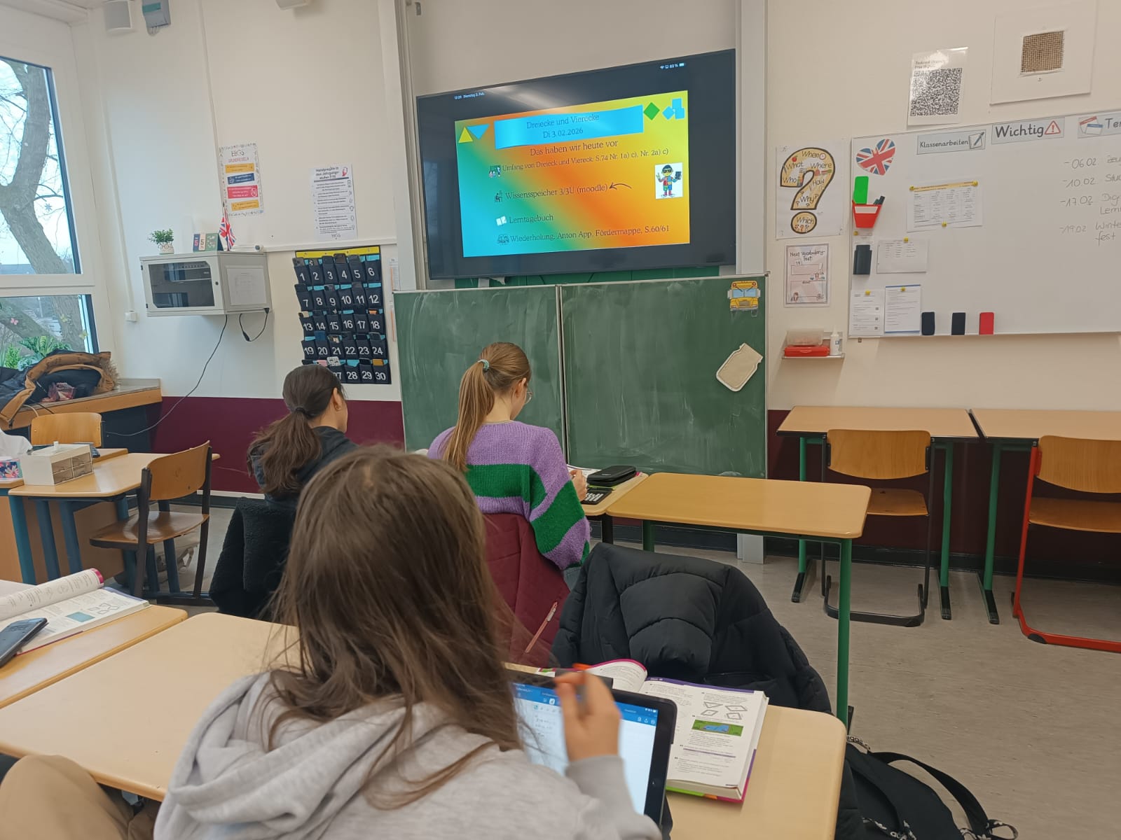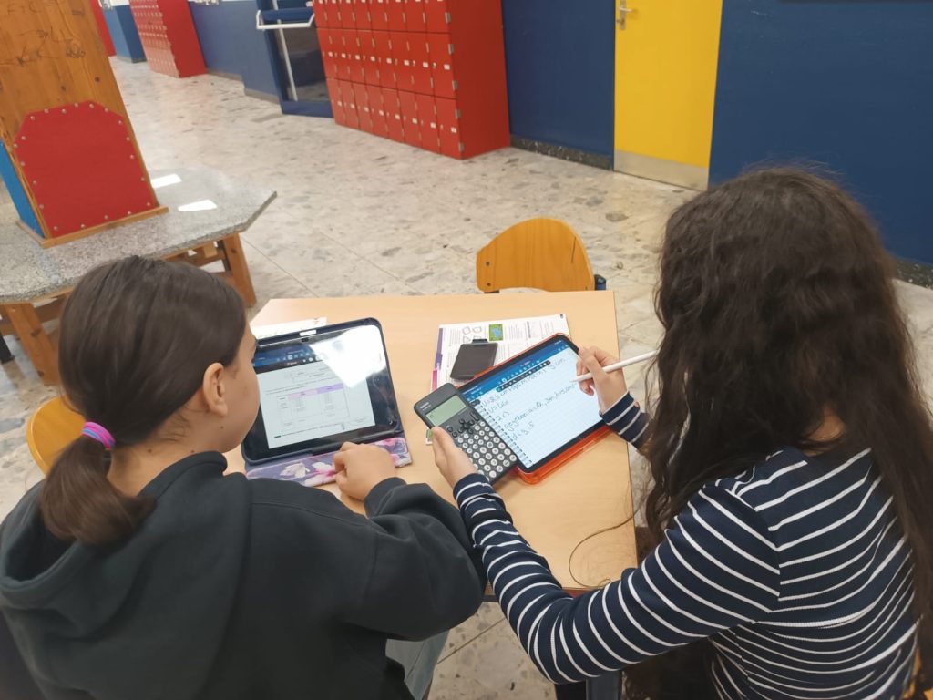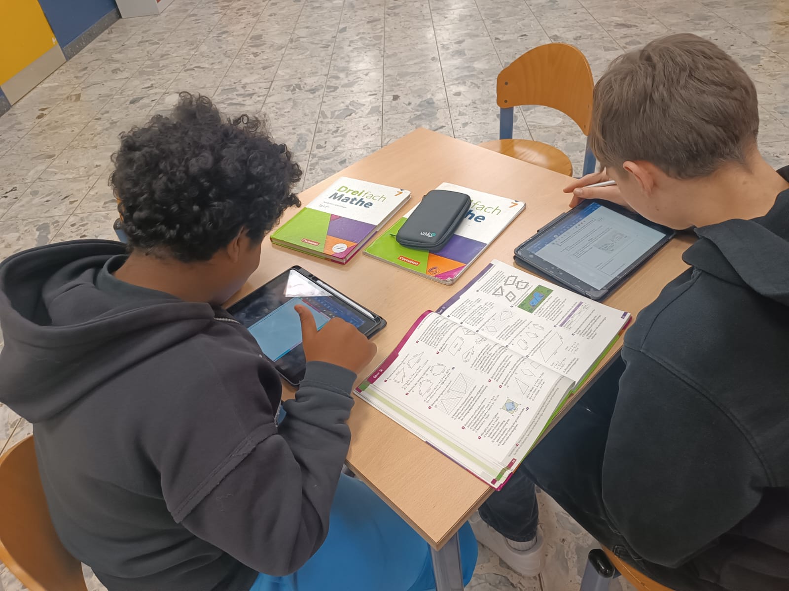 Alle Schülerinnen und Schüler arbeiten in einer 1:1-Ausstattung mit iPads. Aufgaben werden auf unterschiedlichen Niveaustufen angeboten, Lernwege können individuell gewählt werden. Digitale Schreibhefte unterstützen die Selbstorganisation.