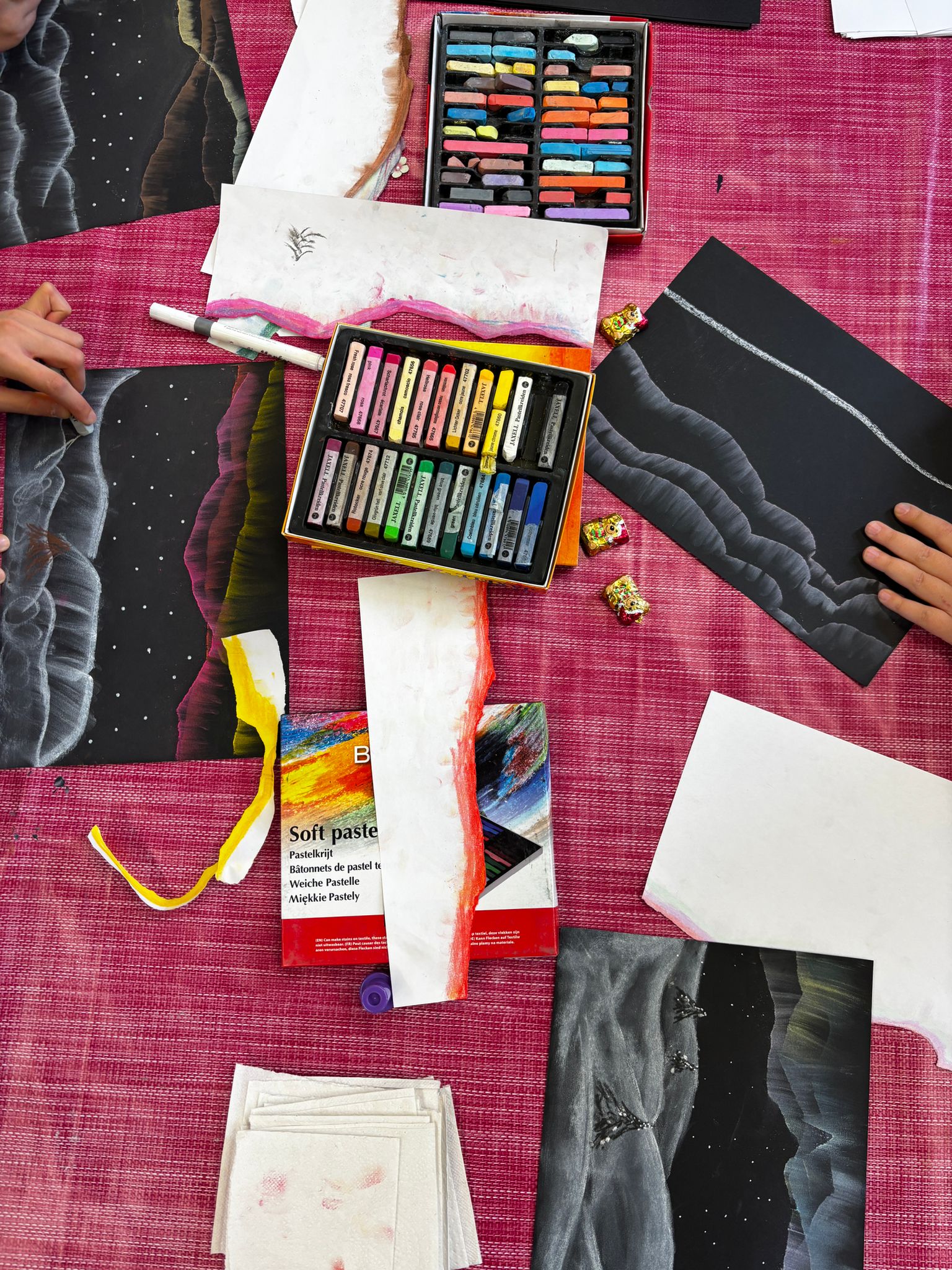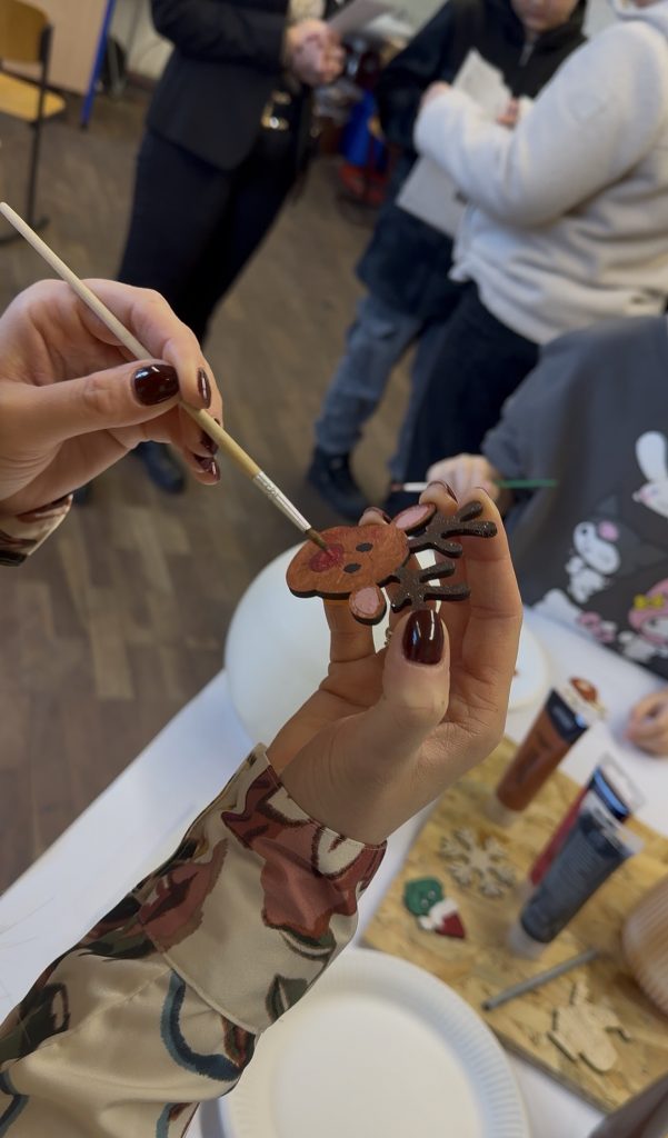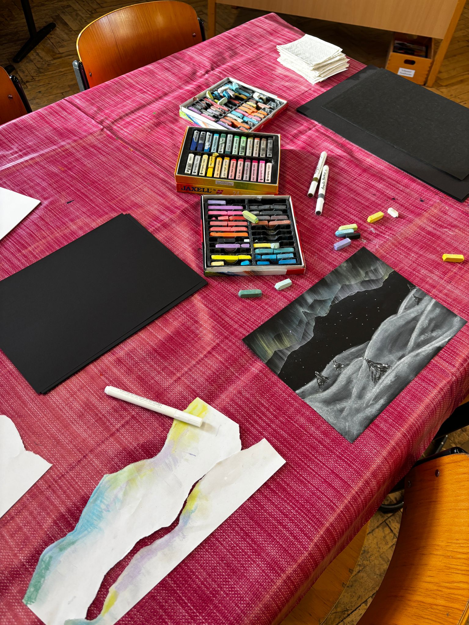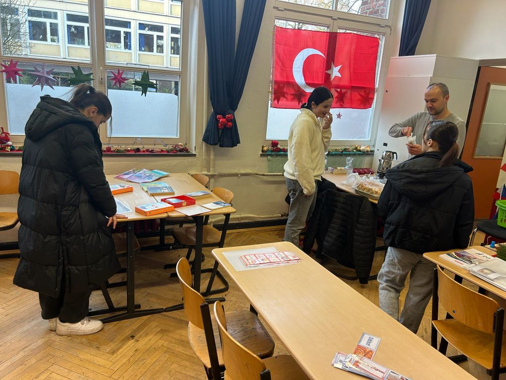 Auch der Anbau wurde lebendig genutzt: Die Schulsozialarbeit stellte ihre Arbeit vor, in der Küche bot die Q2 herzhafte Snacks an, und im Kunstraum konnten Kreidelandschaften und selbst gestaltete Weihnachtskarten entstehen. In der Aula begeisterten Musikgruppen mit kleinen Auftritten.