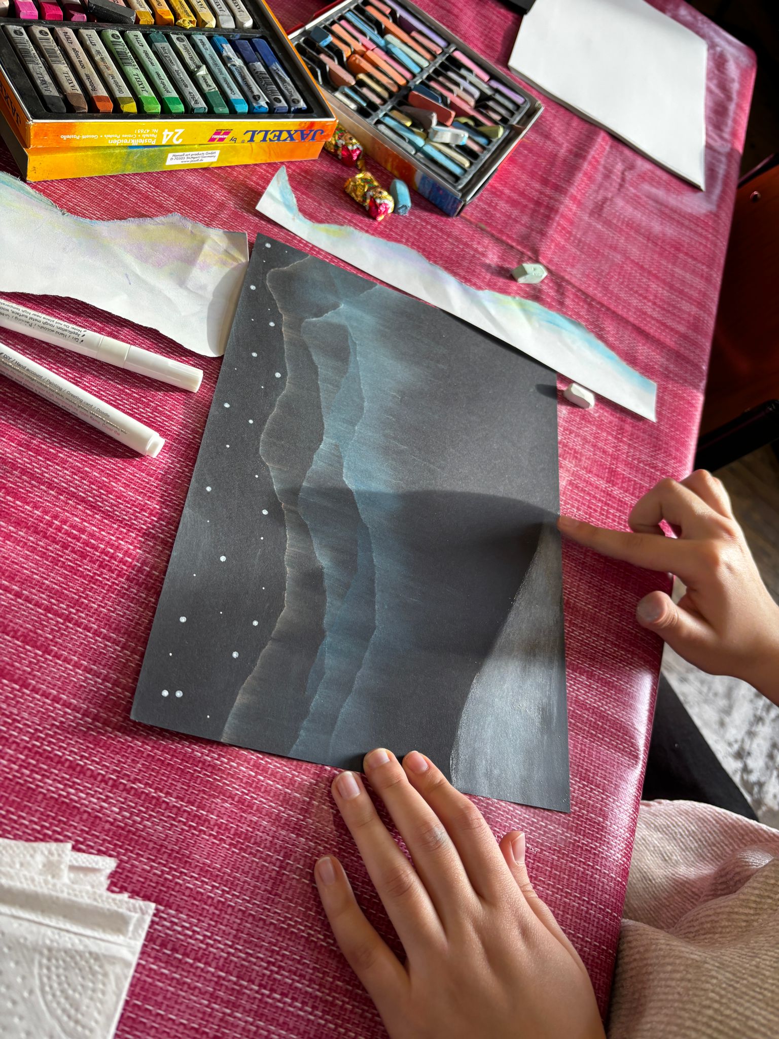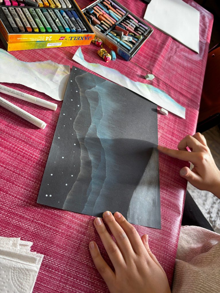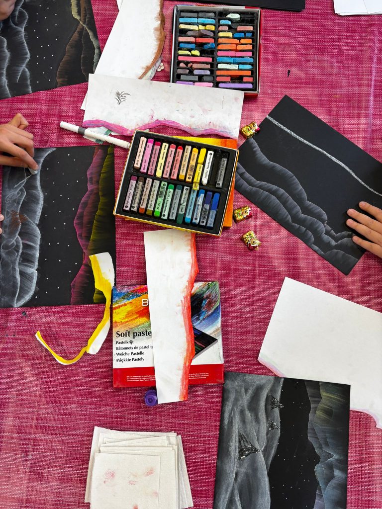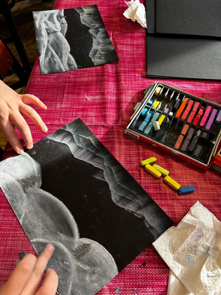 Auch der Anbau wurde lebendig genutzt: Die Schulsozialarbeit stellte ihre Arbeit vor, in der Küche bot die Q2 herzhafte Snacks an, und im Kunstraum konnten Kreidelandschaften und selbst gestaltete Weihnachtskarten entstehen. In der Aula begeisterten Musikgruppen mit kleinen Auftritten.
