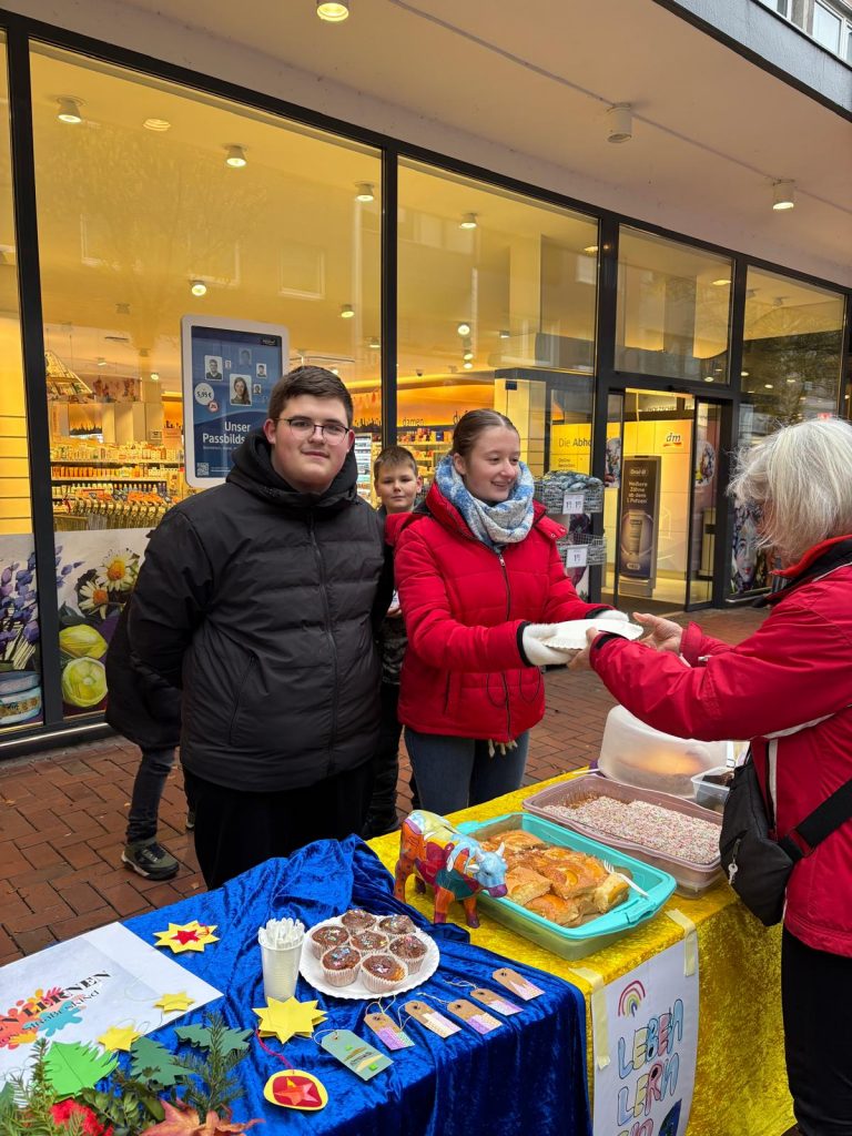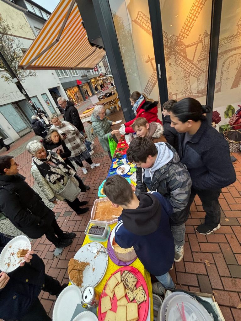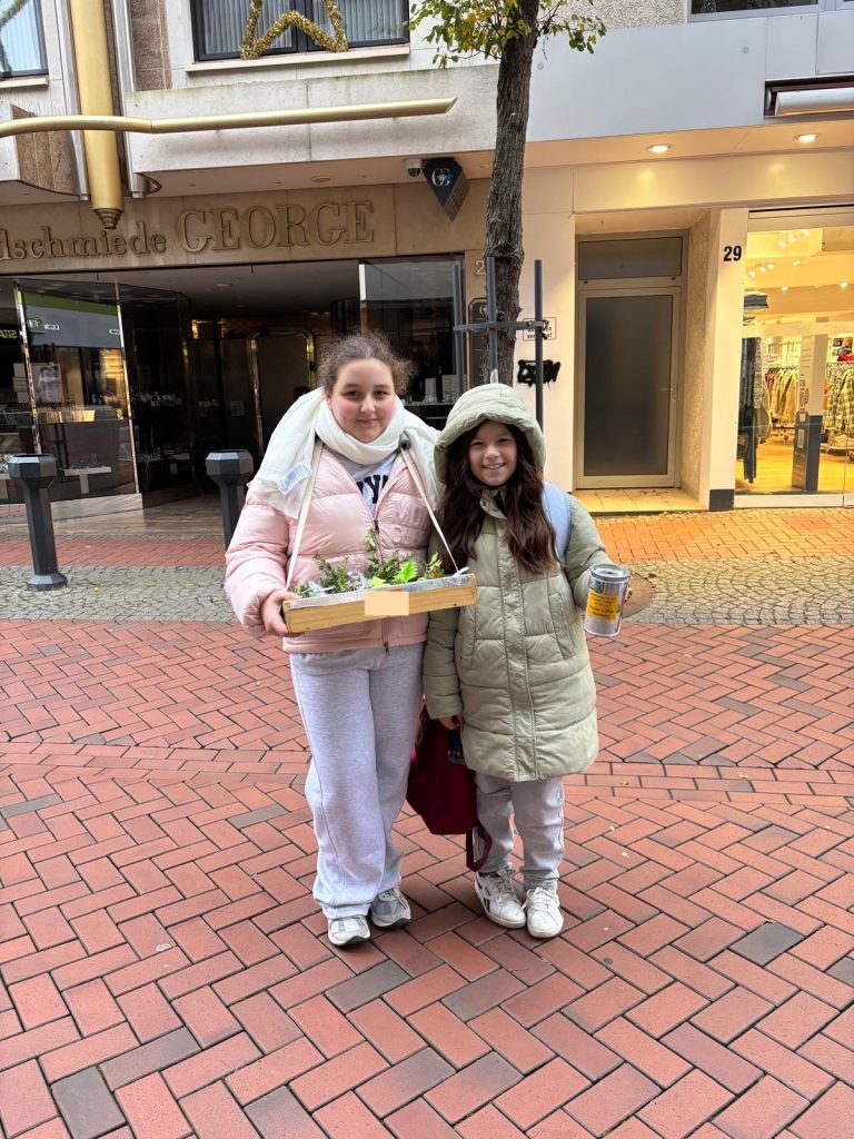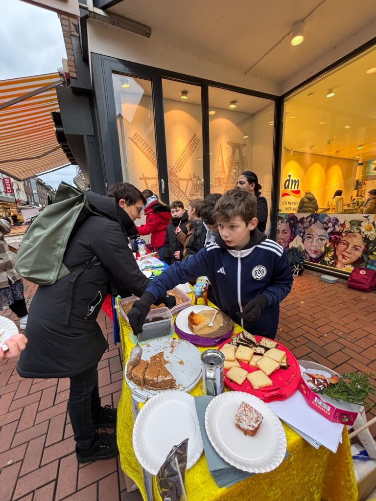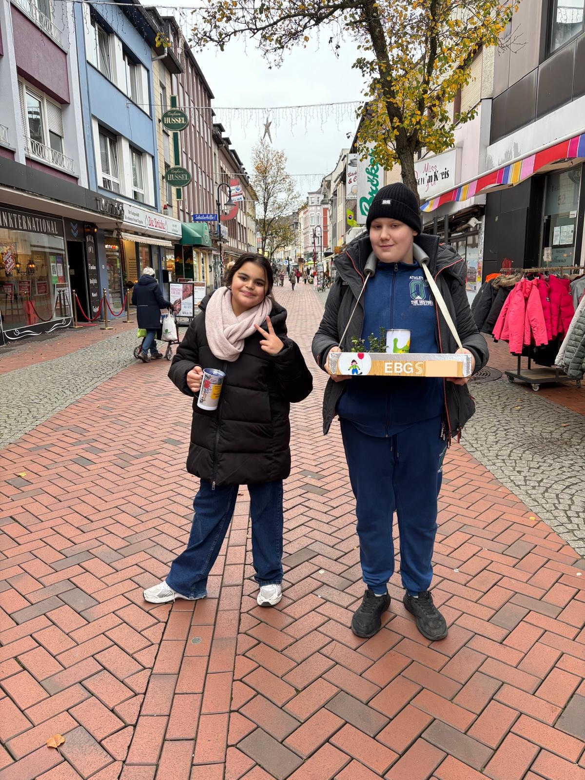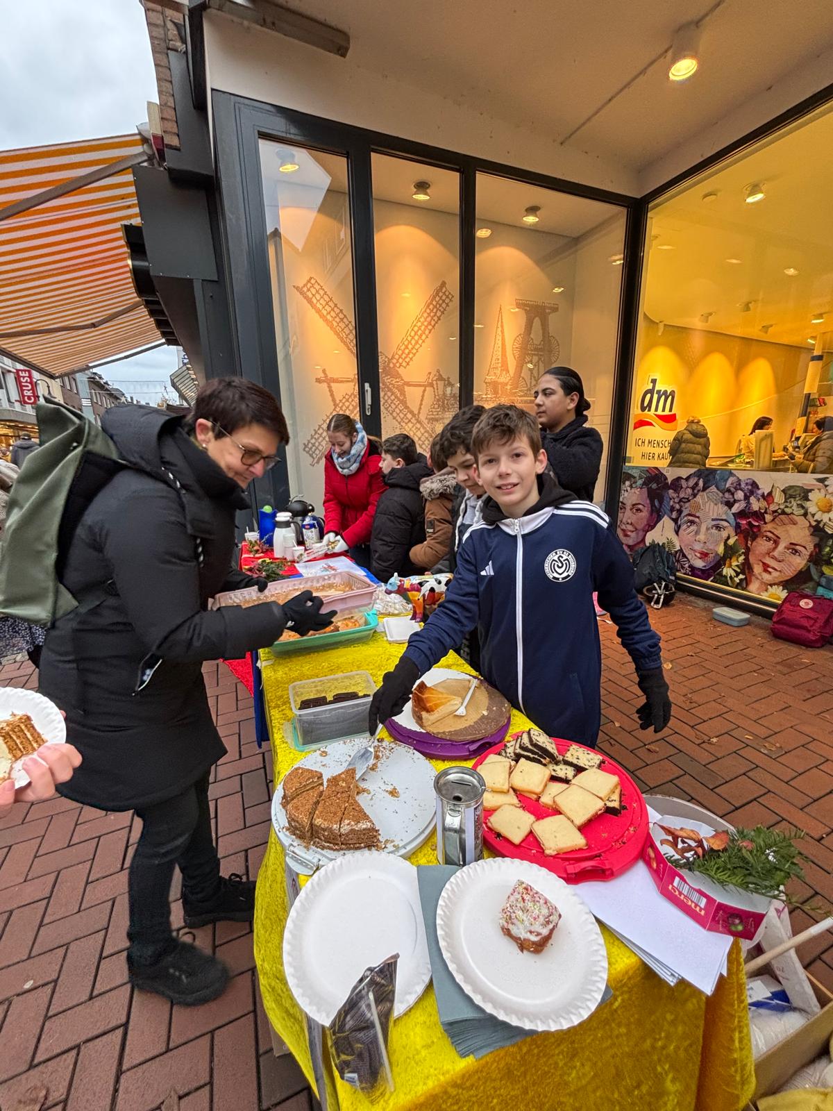 Die Klasse 6e und das Kinderrechtsteam waren am 19.11.2025 mit Unterstützung einiger Eltern in der Innenstadt von Dinslaken unterwegs und haben sich mit vollem Einsatz für die Aktion Straßenkind engagiert. Mit selbstgebackenem Kuchen und Plätzchen, frischem KaCee, liebevoll gebastelten Anhängern und Sträußen, Schuhputzaktionen und tollen Fußballtricks haben unsere Schülerinnen und Schüler viele Passanten angesprochen und Spenden gesammelt. Die Unterstützung kommt über den Aktionskreis Pater Beda den Straßenkindern aus Recife in Brasilien zugute. Trotz Wind und Wetter waren unsere SchülerInnen engagiert, freundlich und haben Durchhaltevermögen gezeigt – wir sind stolz auf euch!