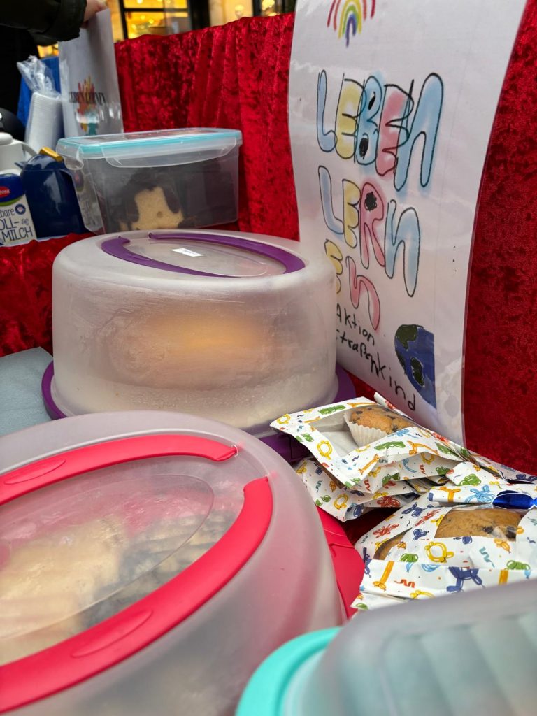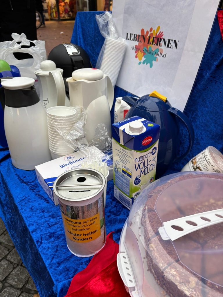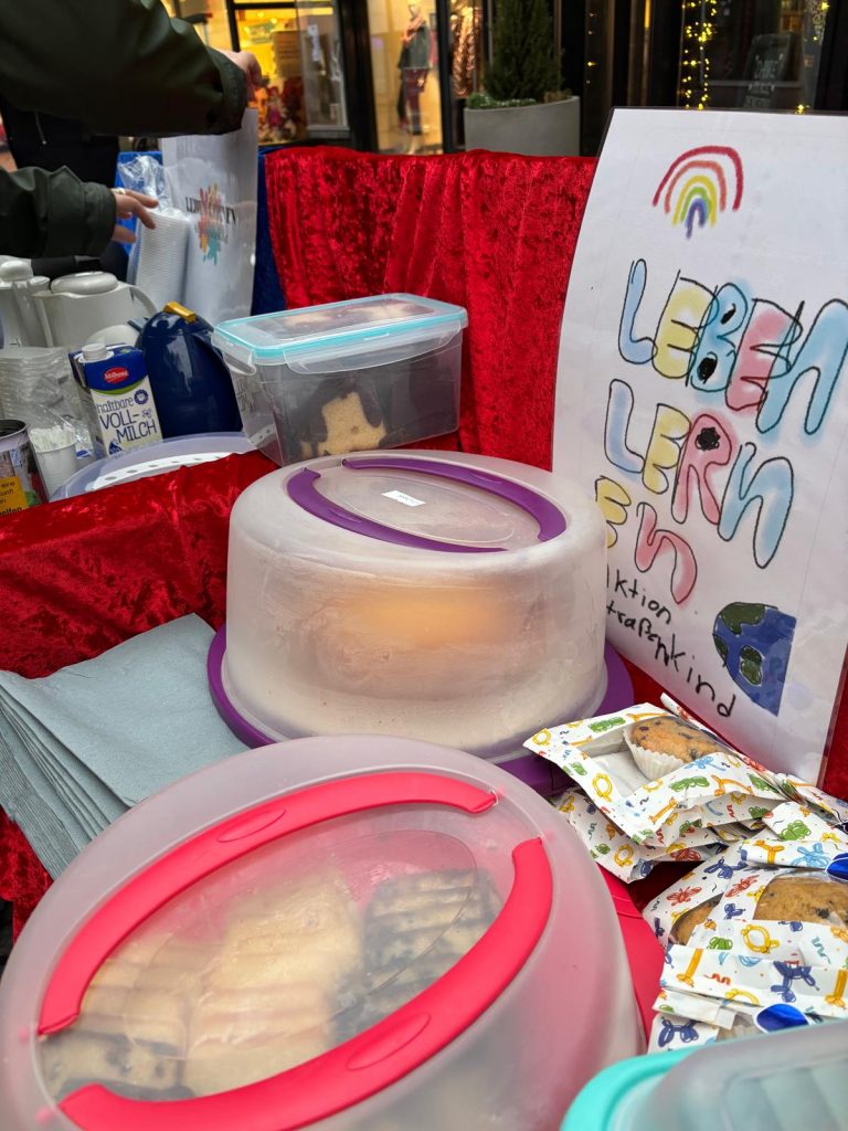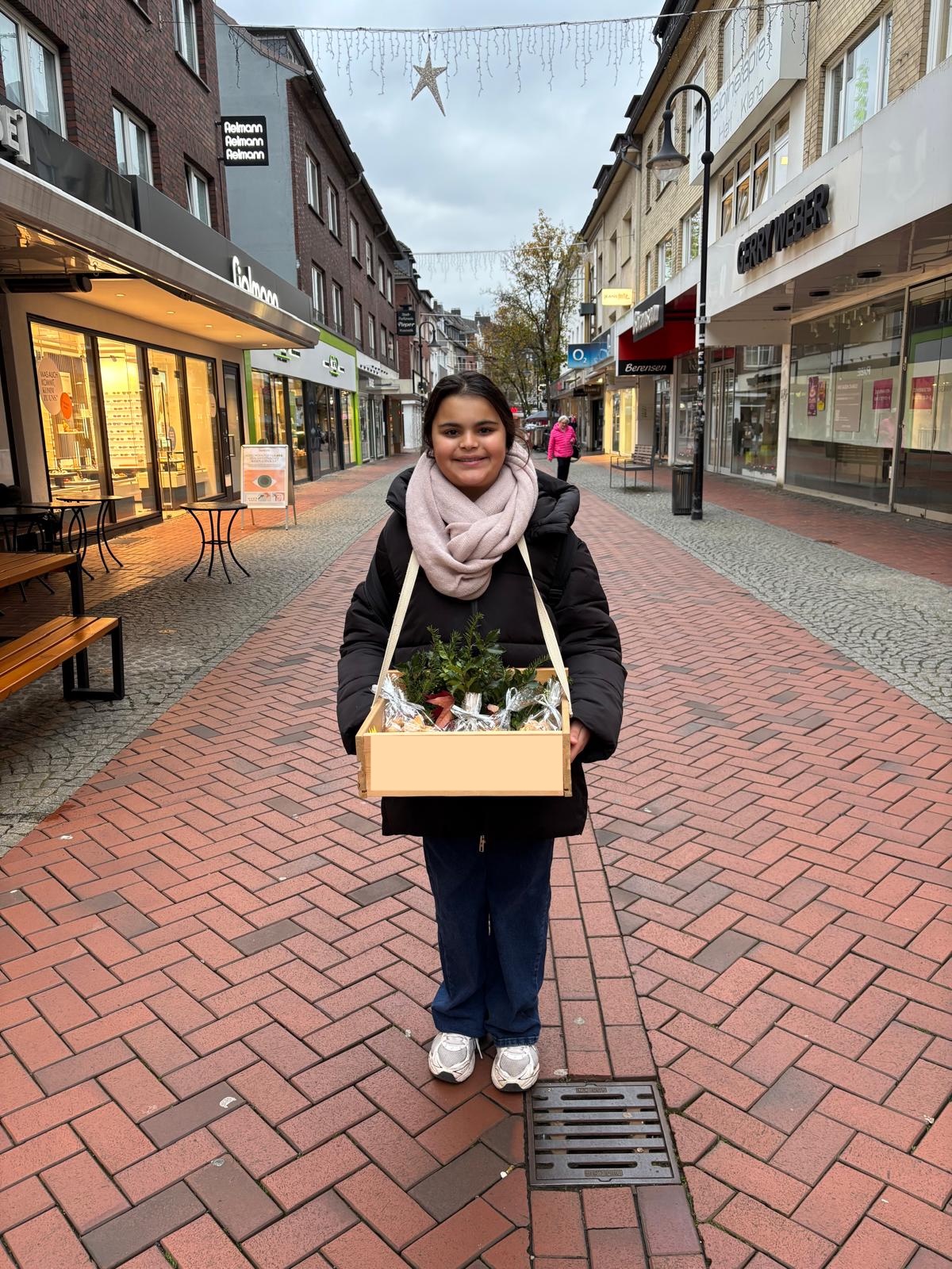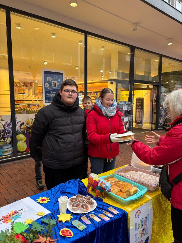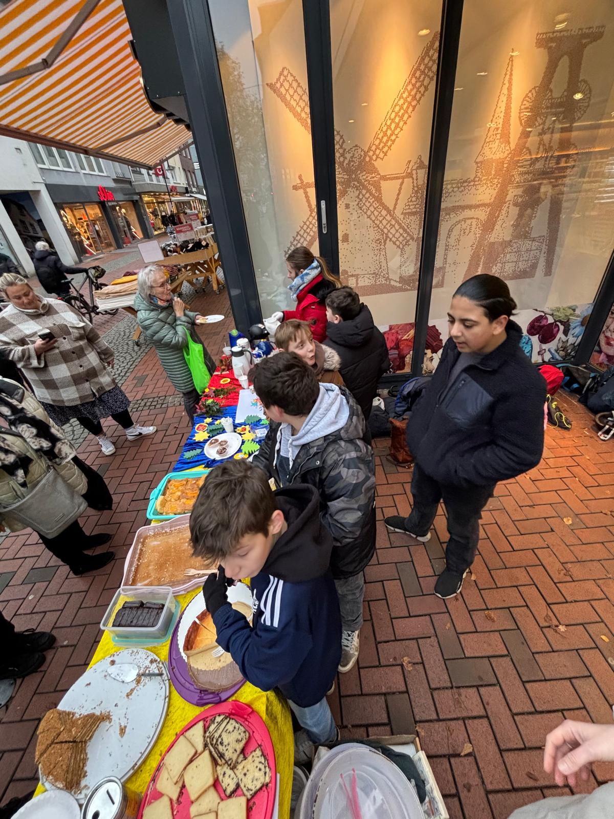 Die Klasse 6e und das Kinderrechtsteam waren am 19.11.2025 mit Unterstützung einiger Eltern in der Innenstadt von Dinslaken unterwegs und haben sich mit vollem Einsatz für die Aktion Straßenkind engagiert. Mit selbstgebackenem Kuchen und Plätzchen, frischem KaCee, liebevoll gebastelten Anhängern und Sträußen, Schuhputzaktionen und tollen Fußballtricks haben unsere Schülerinnen und Schüler viele Passanten angesprochen und Spenden gesammelt. Die Unterstützung kommt über den Aktionskreis Pater Beda den Straßenkindern aus Recife in Brasilien zugute. Trotz Wind und Wetter waren unsere SchülerInnen engagiert, freundlich und haben Durchhaltevermögen gezeigt – wir sind stolz auf euch!