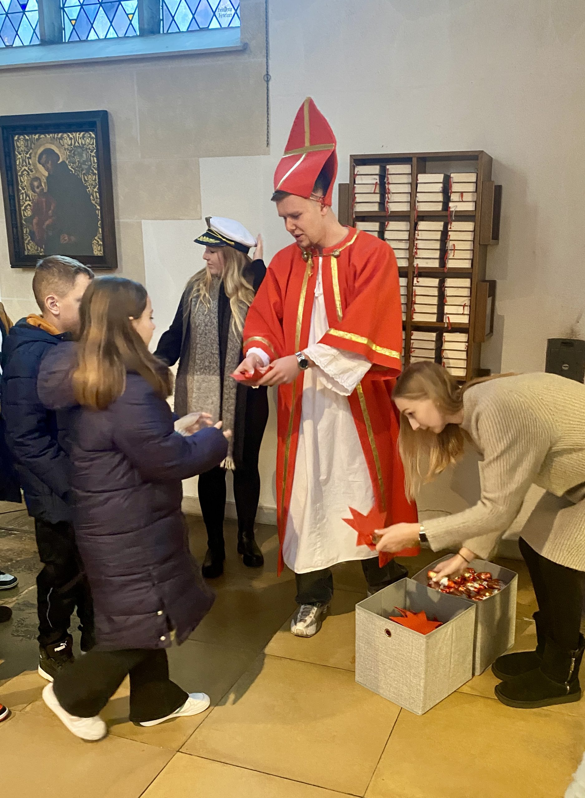 Endlich konnten wir wieder in großer Runde Gottesdienst feiern! Am heutigen Mittwoch sangen, spielten, lauschten und erzählten fast 200 SchülerInnen der EBGS in der St. Vincentius Kirche am Altmarkt in einer Feier rund um das Thema „Nikolaus“. Frau Schraut von der katholischen Kirche und Herr Bröcker von der evangelischen Kirche begleiteten uns dabei .