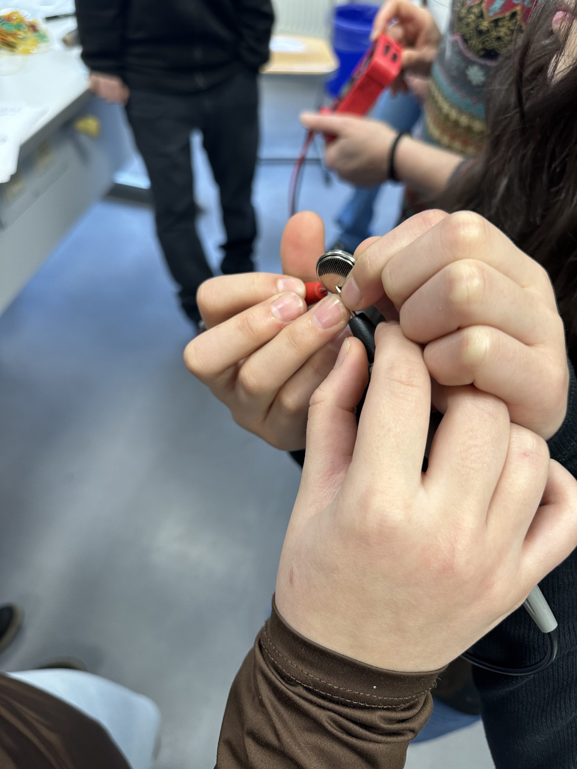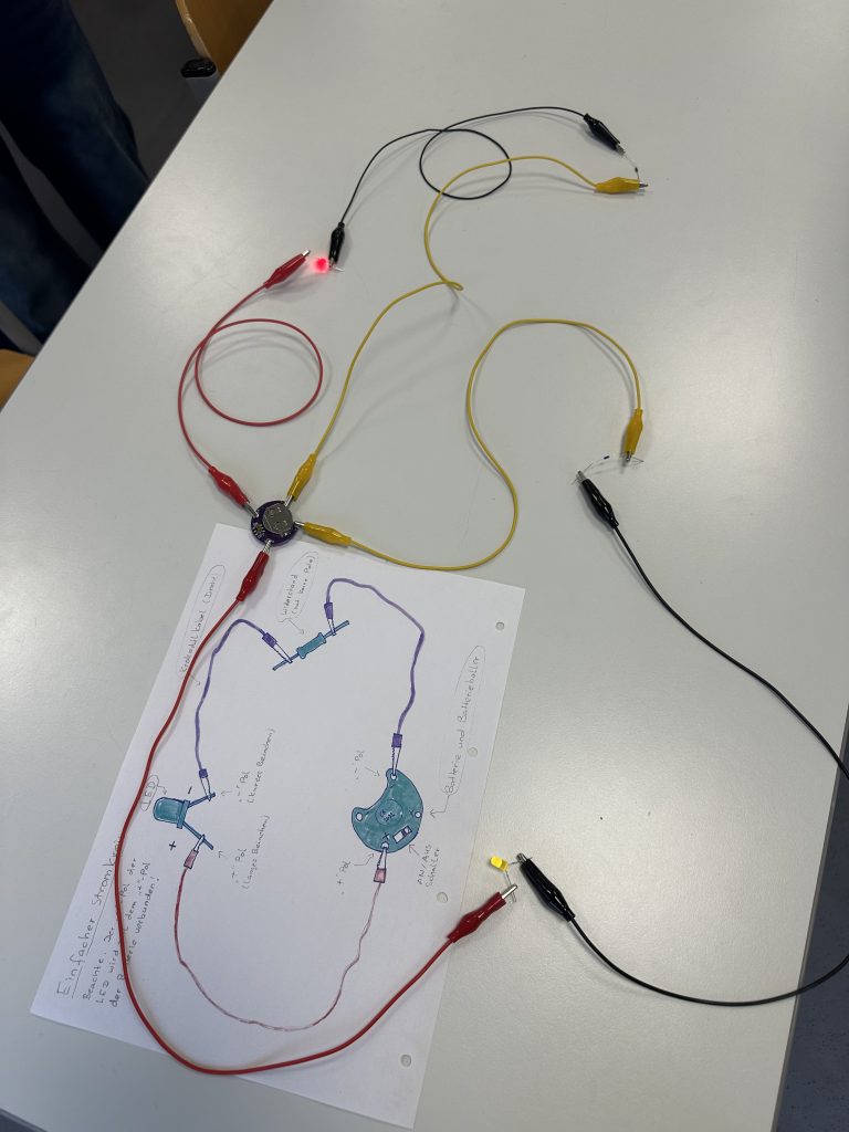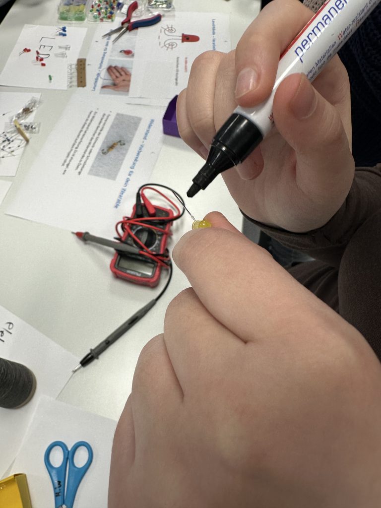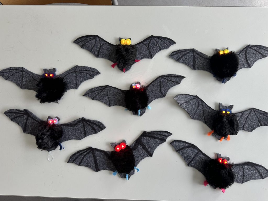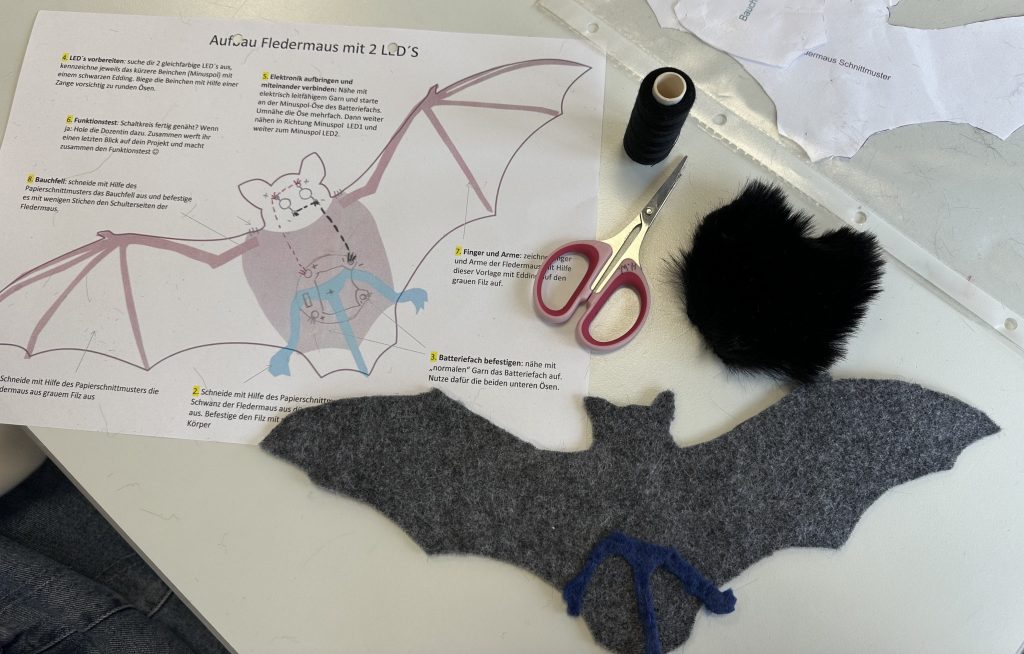 Ein besonderes Highlight des Workshops war die Herstellung einer eigenen Filzfledermaus. Mit elektrisch leitendem Garn nähten die Schülerinnen und Schüler eine kleine Schaltung, die zwei LEDs mit Strom versorgte. Diese dienten der Fledermaus als leuchtende Augen und machten das Werkstück zu einem echten Hingucker. Auf diese Weise wurden Kreativität, handwerkliches Geschick und technisches Verständnis auf anschauliche und motivierende Weise verbunden.
