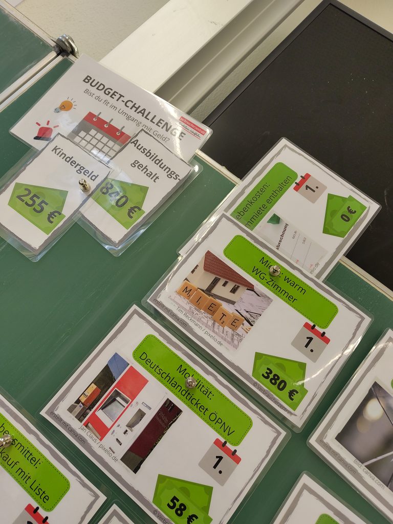 An Hand eines fiktiven Azubigehalts mussten Entscheidungen für einen ganzen Monat getroffen werden: Zweizimmerwohnung oder WG? Neues Sofa abstottern oder lieber ein Gebrauchtes kaufen? Wocheneinkauf spontan oder besser mit Einkaufsliste? Und obwohl die Entscheidungen der Schülerinnen und Schüler klug und sparsam waren, zeigte sich spätestens zur Monatsmitte, dass man als Azubi schnell an die finanziellen Grenzen kommt. Wie kann man da das Budget aufstocken? Und warum benötigt man unbedingt eine Haftpflichtversicherung? All diese Fragen klärten wir spielerisch. Die Schülerinnen und Schüler waren mit viel Eifer dabei. Danke an Frau Leonhardt und die Verbraucherzentrale für das tolle Angebot.