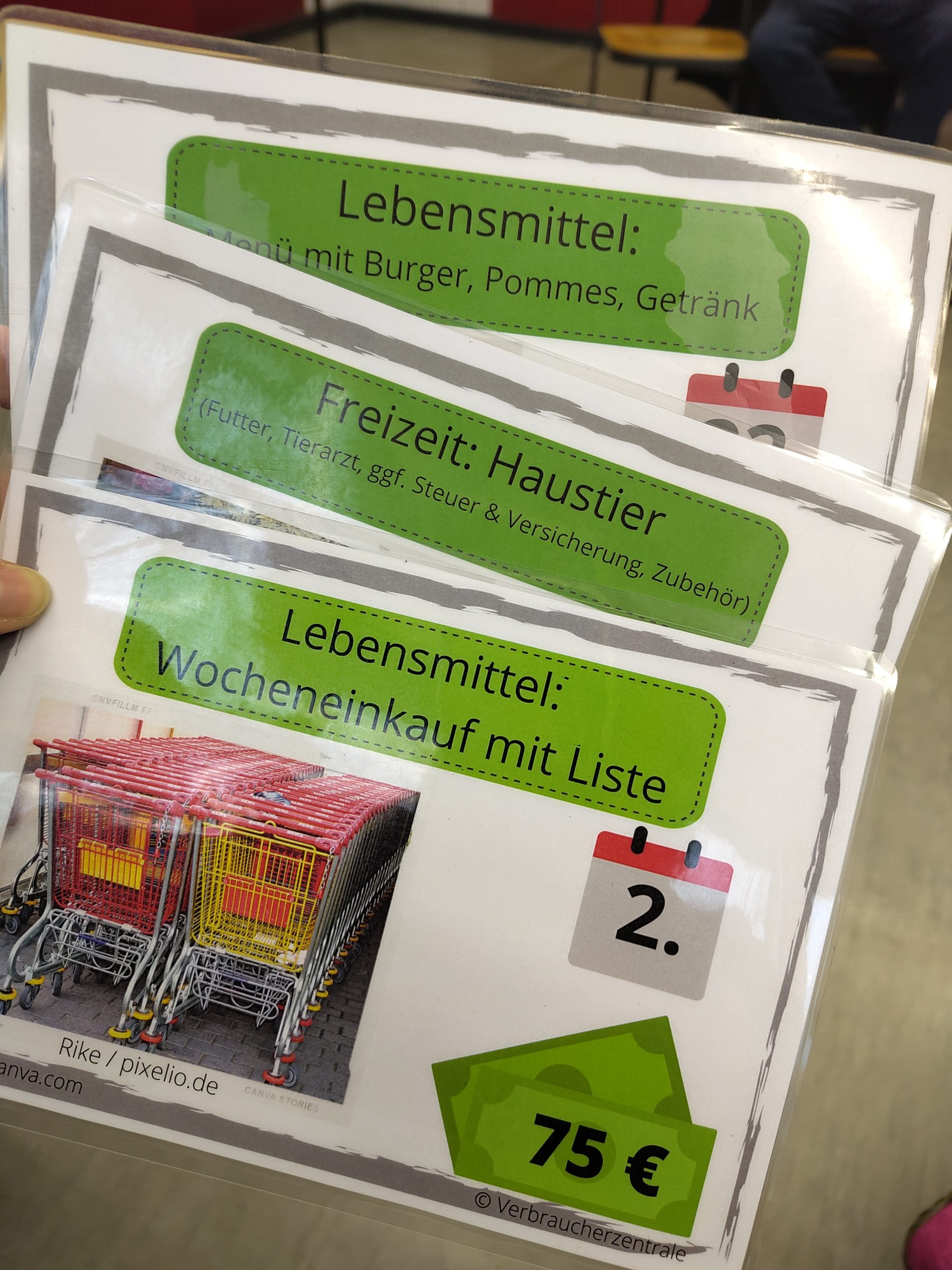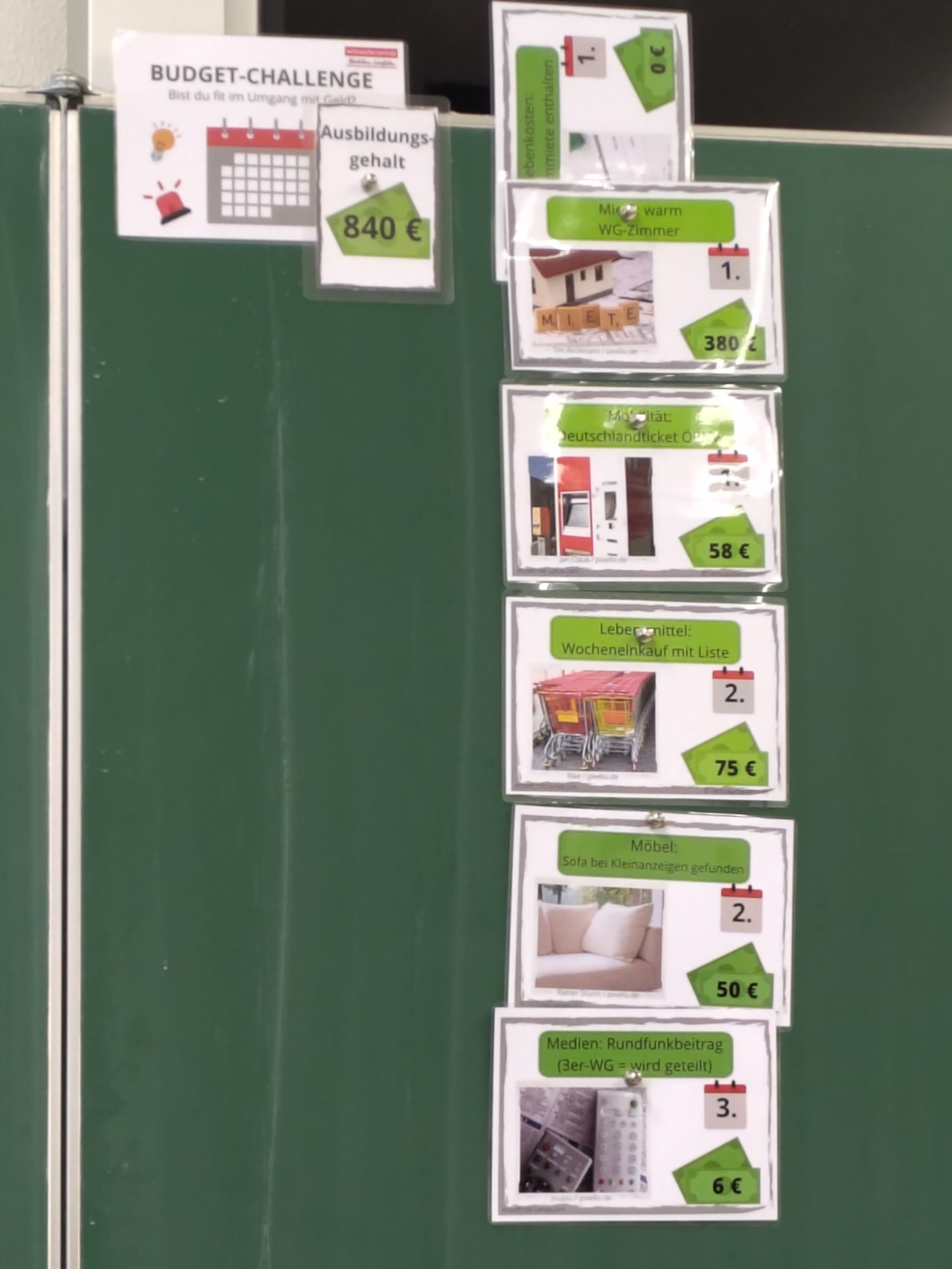 An Hand eines fiktiven Azubigehalts mussten Entscheidungen für einen ganzen Monat getroffen werden: Zweizimmerwohnung oder WG? Neues Sofa abstottern oder lieber ein Gebrauchtes kaufen? Wocheneinkauf spontan oder besser mit Einkaufsliste? Und obwohl die Entscheidungen der Schülerinnen und Schüler klug und sparsam waren, zeigte sich spätestens zur Monatsmitte, dass man als Azubi schnell an die finanziellen Grenzen kommt. Wie kann man da das Budget aufstocken? Und warum benötigt man unbedingt eine Haftpflichtversicherung? All diese Fragen klärten wir spielerisch. Die Schülerinnen und Schüler waren mit viel Eifer dabei. Danke an Frau Leonhardt und die Verbraucherzentrale für das tolle Angebot.